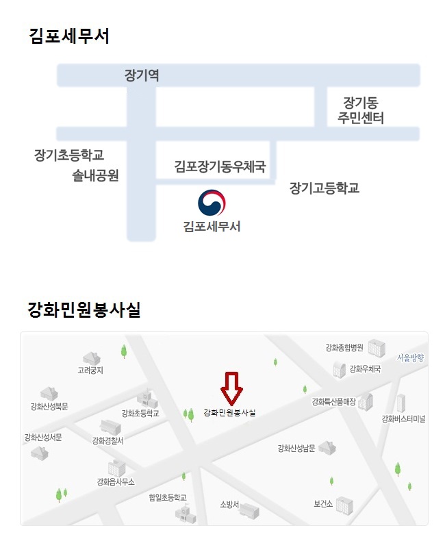 주소본관 : 경기도 김포시 김포한강1로22, 강화민원봉사실 : 인천광역시 강화군 강화읍 강화대로 394