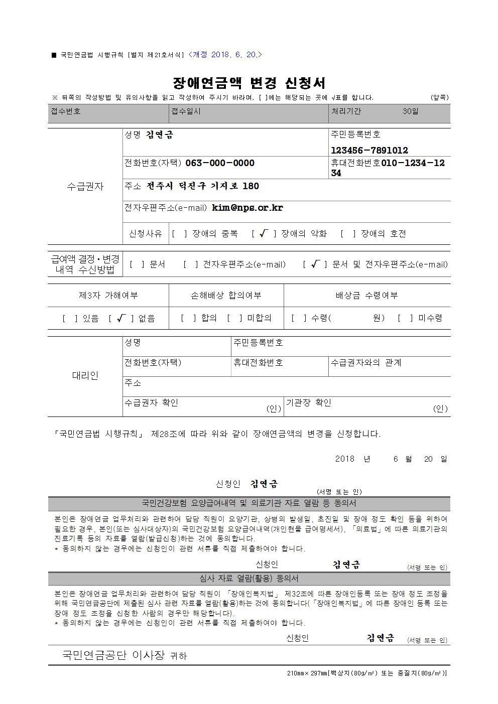 1. 색상이 어두운 난은 신청인이 적지 않습니다. 2. 성명, 주민등록번호, 전화번호, 주민등록표상의 주소는 반드시 적습니다. 3. "장애연금액 변경 사유"란에는 장애연금액의 변경을 신청하려는 사유를 선택하고, 구체적인 사유를 적습니다. 4. "급여액 결정ㆍ변경내역 수신방법"란에는 해당 수급권자가 희망하는 방법을 선택합니다. ※ 급여액 결정ㆍ변경내역은「국민연금법 시행규칙」 제22조제11항에 따라 공단이 지급할 급여액을 결정하거나 이를 변경하면 그 사실을 해당 수급권자에게 통지하는 내용을 말합니다. 이 경우 ‘휴대전화 등에 의한 전자전송’을 선택했으나 수신거부 등의 사유로 발송되지 않은 경우에는 문서로 발송됩니다. 5. "대리인"란은 수급권자의 해외체류, 군복무, 수감 등의 사유발생으로 대리인이 신청하는 경우에 적습니다. 6. "심사자료 열람(활용) 동의서"에 의해 수집된 정보를 통해 장애 상태의 변화가 확인될 경우 재심사 등을 통해 장애등급이 변경(상향 또는 하향)될 수 있습니다. |
