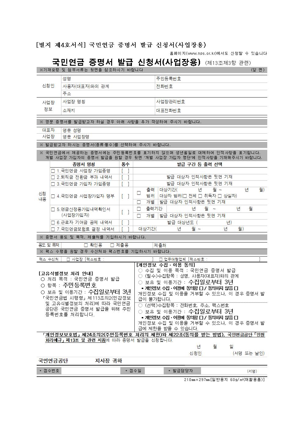 | 「개인정보보호법」제24조의2(주민등록번호 처리의 제한)와 제22조(동의를 받는 방법), 국민연금공단「민원처리예규」제13조 및 관련 지침에 따라 증명서 발급을 신청합니다. | ||||||||||||||||