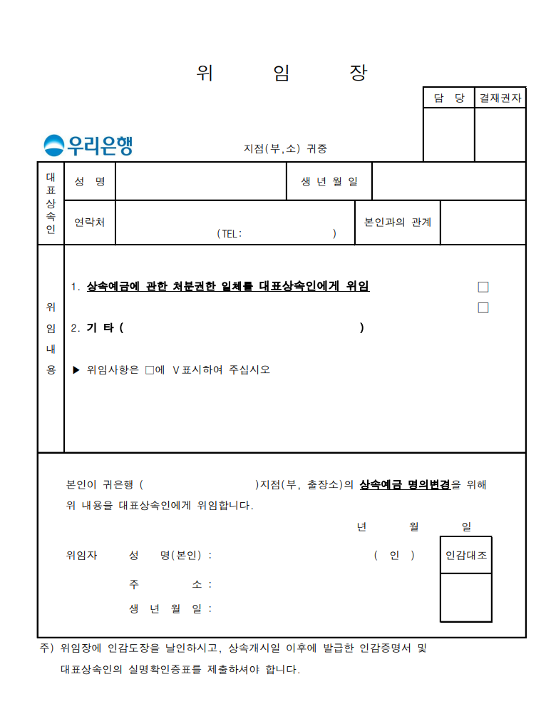 상속예금 위임장 및 상속(유증)예금 명의변경 및 지급의뢰서를