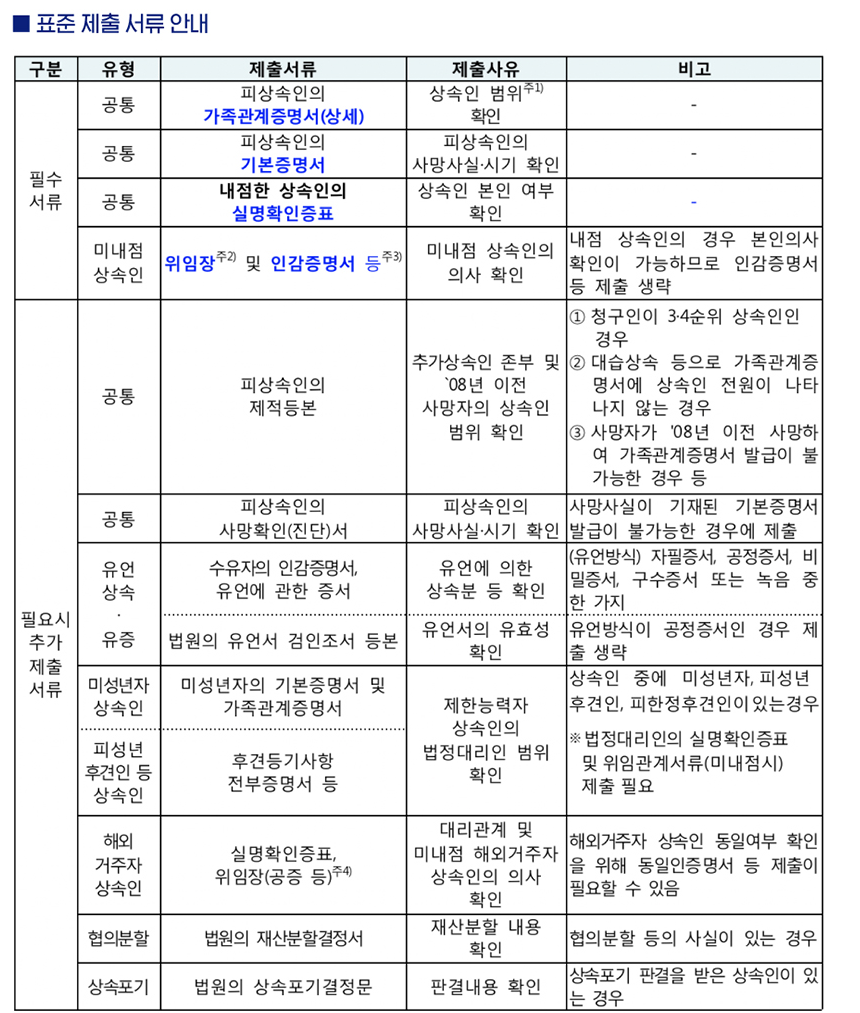 피상속인의 가족관계증명서, 기본증명서, 실명확인증표와