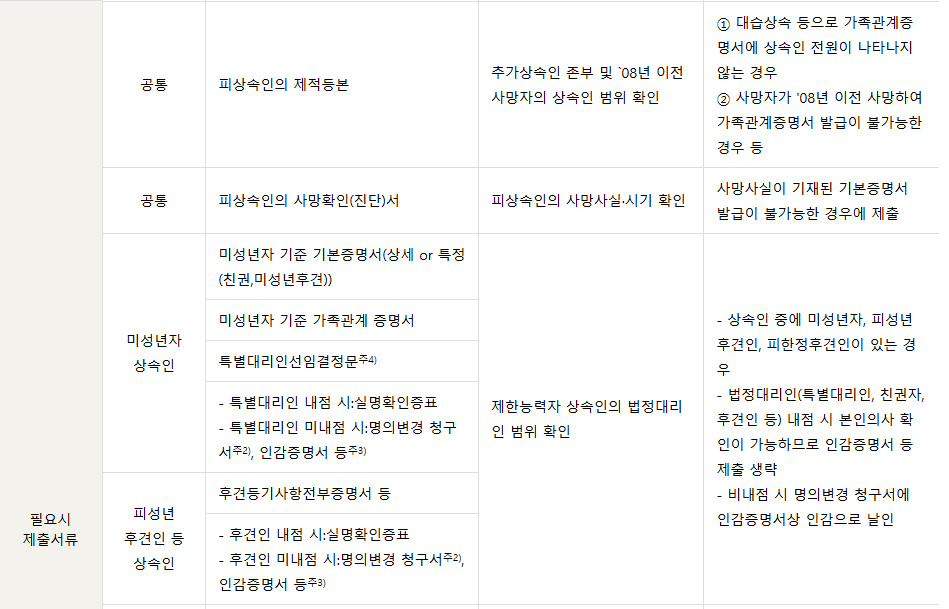 | 공통 | 피상속인의 기본증명서 | 피상속인의 사망사실·시기 확인 | - |