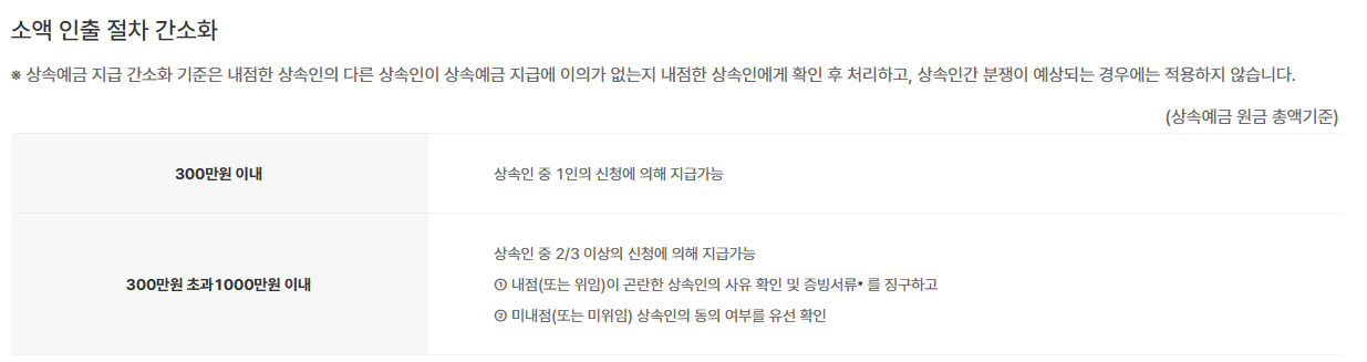 | 미내점상속인 | 위임장² 및 인감증명서 등³ | 미내점 상속인의 의사 확인 | 내점 상속인의 경우 본인의사 확인이 가능하므로 인감증명서 등 제출 생략 |