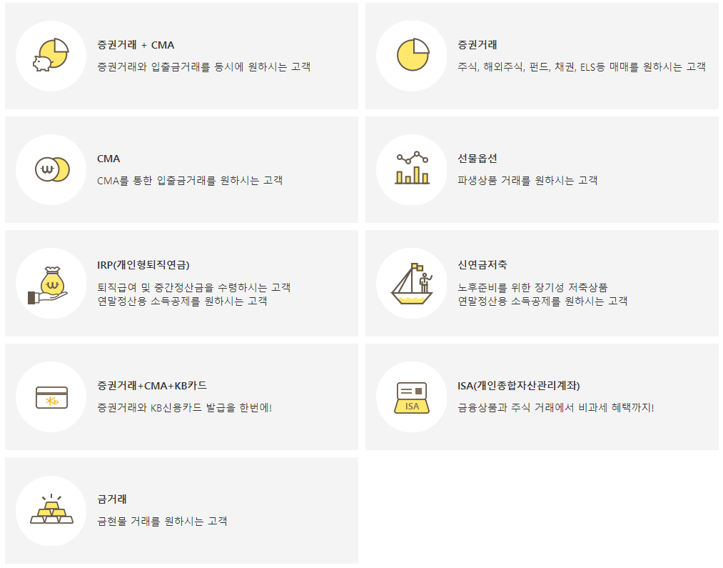 KB증권 비대면 가능상품은 다음과 같습니다.