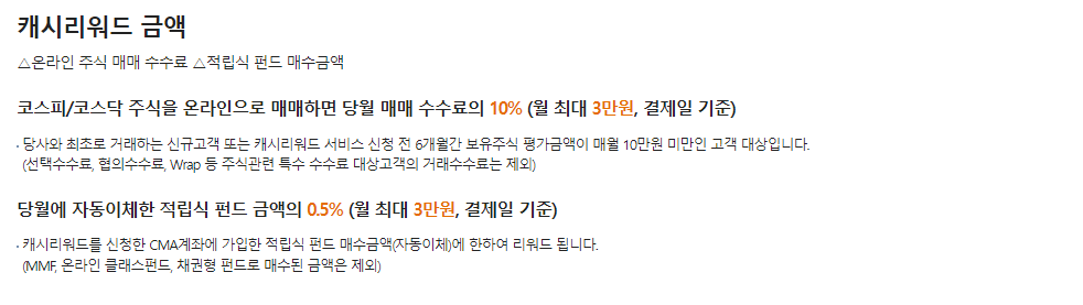 캐시리워드를 신청한 CMA계좌에 가입한 적립식 펀드 매수금액(자동이체)에 한하여 리워드 됩니다.