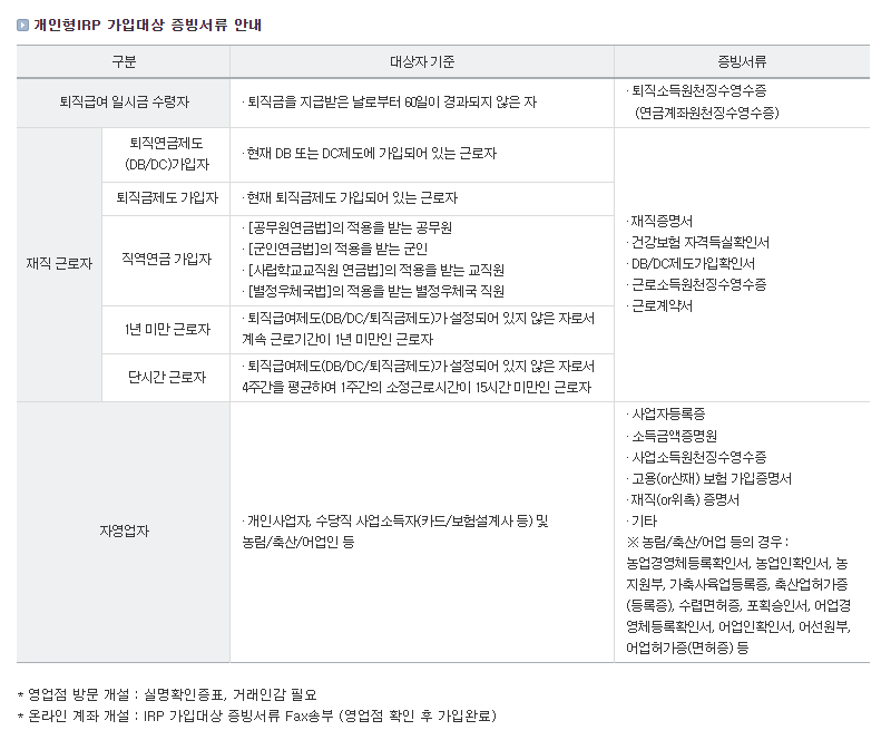 또한 개인형 IRP 가입대상 증빙서류는 다음과 같습니다.