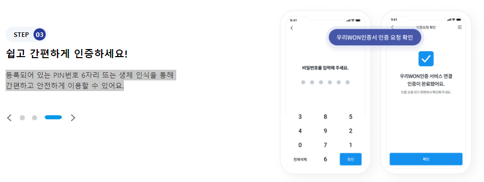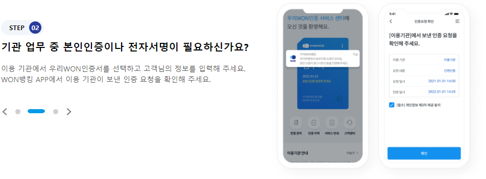 우리WON인증서 안내 전자서명법에 따른 전자서명 인증업무 운영기준 준수 여부를 인정받아 안전하게 이용하실 수 있는 우리은행의 전자서명 인증 서비스입니다. 본인 인증과 전자서명이 필요한
