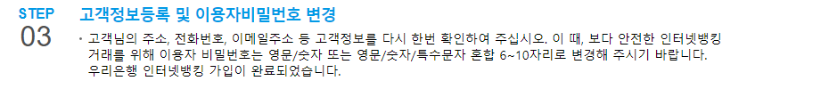 이 때, 보다 안전한 인터넷뱅킹거래를 위해 이용자 비밀번호는 영문/숫자 또는 영문/숫자/특수문자 혼합 6~10자리로 변경해 주시기 바랍니다.