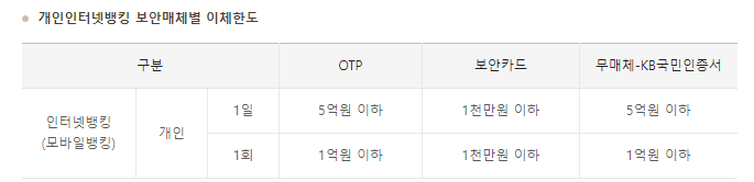 - 영업점에서 보안매체를 OTP 또는 무매체-KB국민인증서로 변경시 이체한도 최대 1억원/5억원으로 변경하실 수 있습니다.