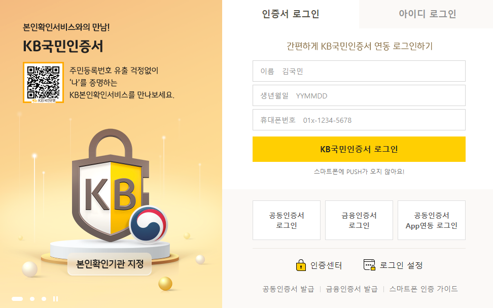 KB국민은행에서 인정한 인증수단을 통해 서비스 이용을 부탁드립니다.(유료 개인 범용인증서는 현행과 동일)