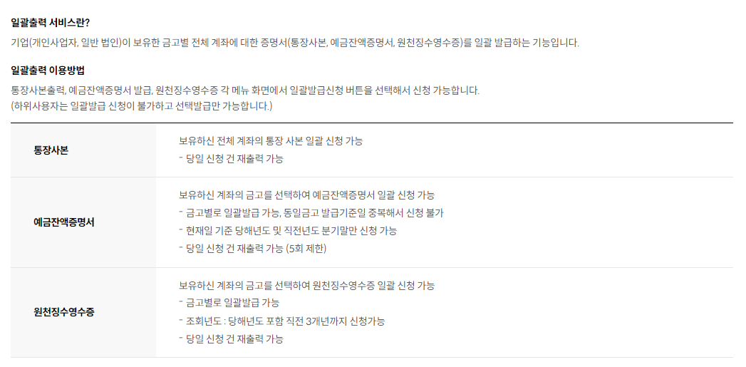 기업(개인사업자, 일반 법인)이 보유한 금고별 전체 계좌에 대한 증명서(통장사본, 예금잔액증명서, 원천징수영수증)를 일괄 발급하는 기능입니다.