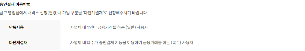 금고 영업점에서 서비스 신청(변경)시 가입 구분을 다단계결재로 신청해주시기 바랍니다.