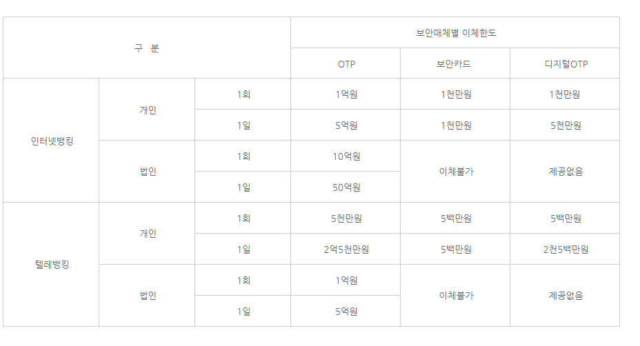 이체한도를 보다 높게 지정하시려면 보다 안전한 보안매체인 OTP 이용을 권장드립니다.