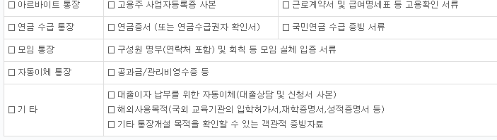 | □ 기 타 | □ 대출이자 납부를 위한 자동이체(대출상담 및 신청서 사본) □ 해외사용목적(국외 교육기관의 입학허가서,재학증명서,성적증명서 등) □ 기타 통장개설 목적을 확인할 수 있는 객관적 증빙자료 |