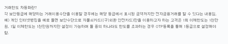 예) 개인 인터넷뱅킹을 예로 들면 보안수단으로 자물쇠카드((구)외환 안전카드)만을 이용하고자 하는 고객은 1회 이체한도는 1천만원, 1일 이체한도는 1천만원까지만 설정이 가능하며 둘 중의 하나라도 한도를 초과하는 경우 OTP등록을 통해 1등급으로 설정해야 함.