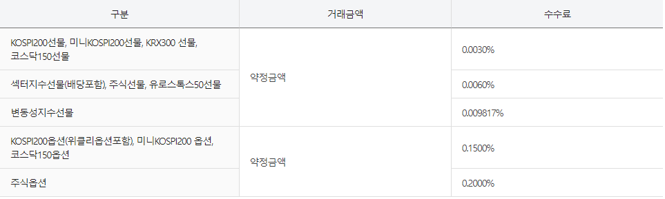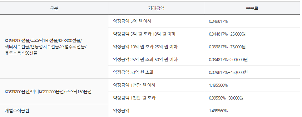 - 선물 : 0.00025104%(거래소 수수료) / 옵션 : 0.012654%(거래소 수수료)