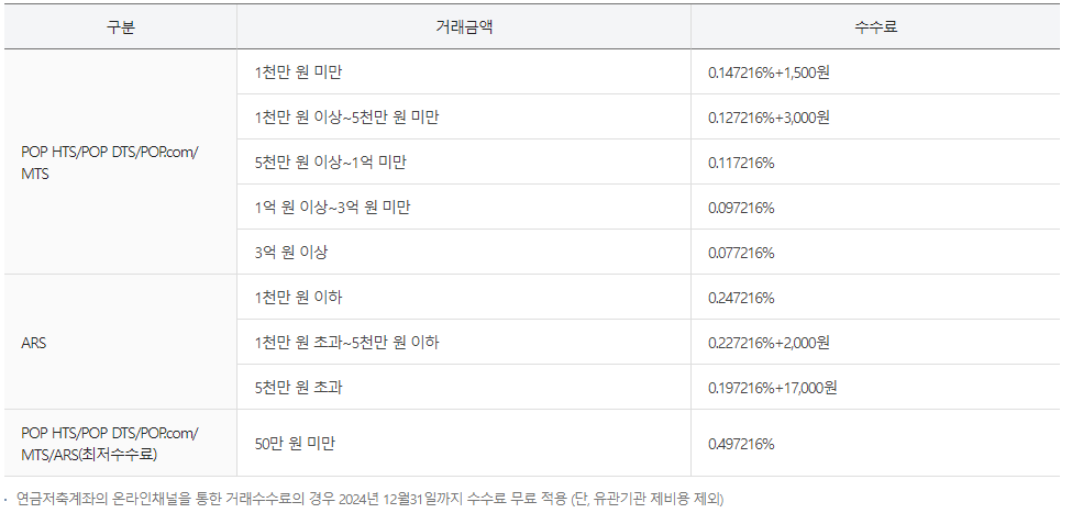 | 주식 수수료에 유관기관제비용이 포함되어 있습니다. 최저수수료 : 거래금액 50만원 미만 반대매매 주문 : 오프라인 수수료 적용 미수금 발생 후 미수금 변제일까지 입금하지 않으시면 일수에 따라 연 11%의 미수금 연체이자가 발생합니다. ELW, 장내수익증권, 신주인수권증권, 신주인수권증서, 시간외단일가는 주식 수수료와 동일합니다. 수수료 징수 기준 : 당일 매매분에 대해 동일종목 매수별/매도별, 채널별 각 기준으로 현금매매와 신용매매, 대출매도를 분리하여 징수 상기 수수료는 회사 사정에 따라 사전통지 없이 변경 될 수 있습니다. |