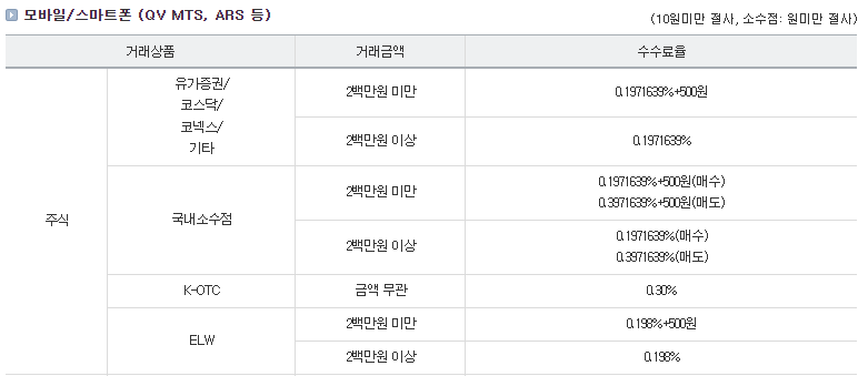 ETF, ETN, 신주인수권증서와 같은 특정 증권을 거래하실 때 수수료는 거래방식에 따라 다르게 적용됩니다.