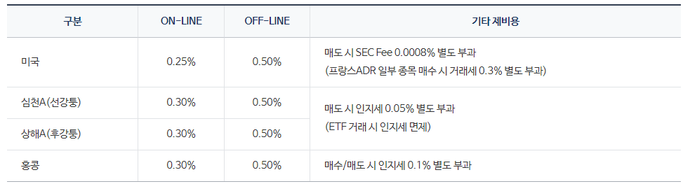 국가별 제비용(SEC Fee, 인지세 등)은 별도 부과되며, 해당 기관의 정책 변경에 따라 수시 변경될 수 있습니다.