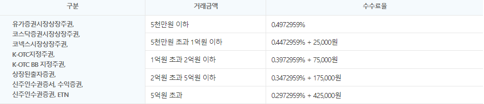- 국내주식(코스피, 코스닥, 코넥스) : 0.0036396% (거래소 수수료 : 00027209% + 예탁결제원 수수료 : 0.0009187%)