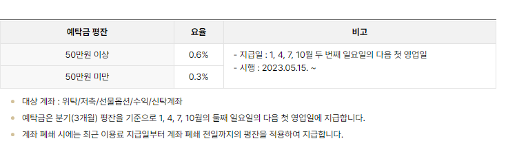 예탁금은 분기(3개월) 평잔을 기준으로 1, 4, 7, 10월의 둘째 일요일의 다음 첫 영업일에 지급합니다.