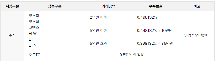 주식(거래소/코스닥/코넥스) : 0.0036396%(한국거래소 수수료 0.0027209% + 한국예탁결제원 수수료 0.0009187%)