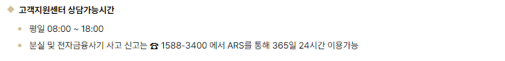 분실 및 전자금융사기 사고 신고는 ☎ 1588-3400 에서 ARS를 통해 365일 24시간 이용가능