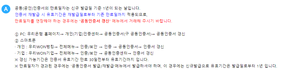 · 개인 : 우리WON뱅킹→ 전체메뉴→ 인증/보안 → 인증 → 공동인증서→ 인증서 갱신