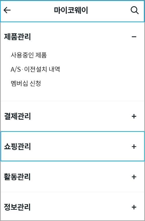 1. [마이코웨이>쇼핑관리>주문내역 페이지]에서 반품/교환을 원하시는 주문을 선택 후 반품/교환을 신청해주시면 됩니다.