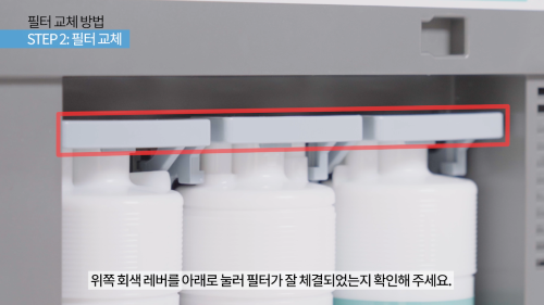 위쪽 회색 레버를 아래로 눌러 필터 체결을 확인해주세요.