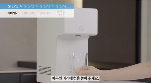 먼저, 교체하는 과정에서 소량의 물이 배수될 수 있으니 정수기 앞에 빈 컵을 놓으시고 상단 정수기 커버를 뒤로 밀어서 열어주세요.