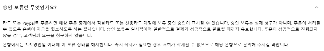 승인 보류는 일시적이며 일반적으로 결제가 성공적으로 완료될 때까지 유효합니다. 주문이 성공적으로 진행되지 않을 경우, 고객님께 요금을 청구하지 않습니다.