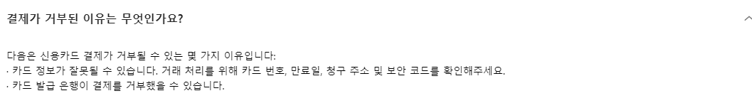 · 카드 정보가 잘못될 수 있습니다. 거래 처리를 위해 카드 번호, 만료일, 청구 주소 및 보안 코드를 확인해주세요.