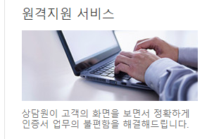 원격지원 서비스 상담원이 고객의 화면을 보면서 정확하게 인증서 업무의 불편함을 해결해드립니다. 고객센터/세금계산서 안내 상담 및 문의전화 1577-7337 FAX : 02-767-7390 (국번없이 전국단일 / 휴