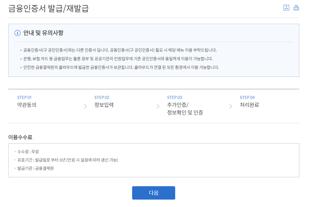 (4) 금융인증서 발급/재발급을 클릭한다.