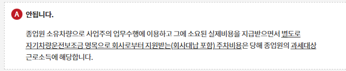 별도로 자기차량운전보조금 명목으로 회사로부터 지원받는(회사대납 포함) 주차비용은 당해 종업원의 과세대상 근로소득에 해당합니다.