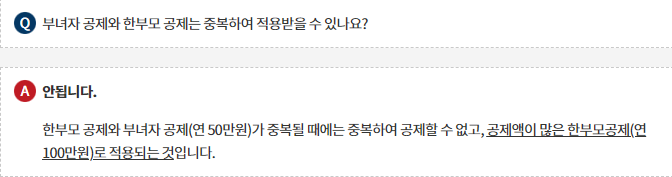 한부모 공제와 부녀자 공제(연 50만원)가 중복될 때에는 중복하여 공제할 수 없고,