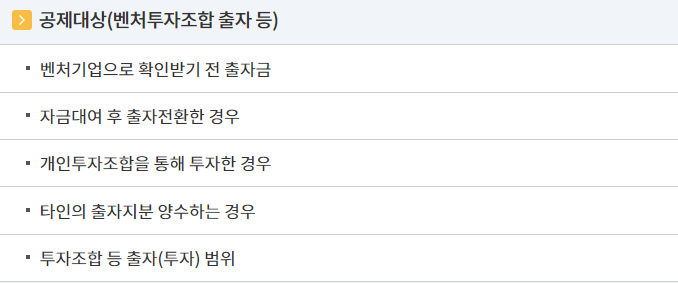 | ○ 위 1, 2, 5번 항목 : 출자투자금액의 10% 공제 ○ 위 3, 4, 6번 투자 - 3,000만원 이하 : 투자금액의 100% - 3,000만원 초과 5,000만원 이하 : 투자금액의 70% - 5,000만원 초과 : 투자금액의 30% |