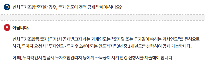 벤처투자조합등 출자(투자)시 공제받고자 하는 과세연도는 "출자일 또는 투자일이 속하는 과세연도"를 원칙으로 하되, 투자자 요청시 "투자연도~ 투자후 2년이 되는 연도까지" 3년 중 1개년도를 선택하여 공제 가능합니다.
