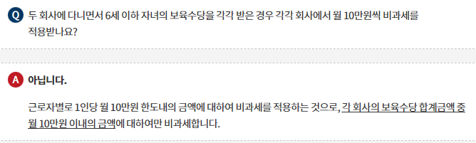 두 회사에 다니면서 6세 이하 자녀의 보육수당을 각각 받은 경우 각각 회사에서 월 10만원씩 비과세를 적용받나요?