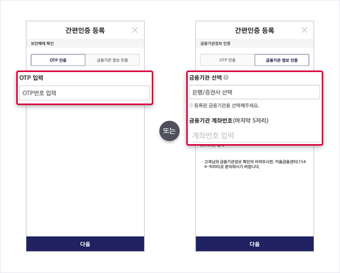 • ID인증, 계좌인증 또는 공동인증 중 1개를 선택하여 고객정보 확인