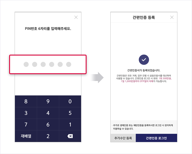 - 간편인증 PIN번호 6자리 설정