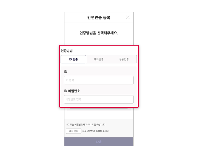 - ID인증, 계좌인증 또는 공동인증 중 1개를 선택하여 고객정보 확인