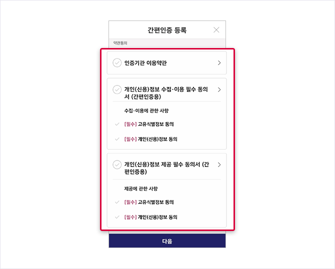 - 이용약관 동의, 개인정보 수집·이용 동의, 개인정보 제공에 대한 동의를 진행후 “다음"버튼 클릭