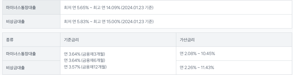 금리는 '기준금리 + 고객별 가산금리'로 계산됩니다. 특히 마이너스통장대출의 경우, 기준금리로 금융채 3개월, 6개월, 12개월 중에서 선택할 수 있어요.
