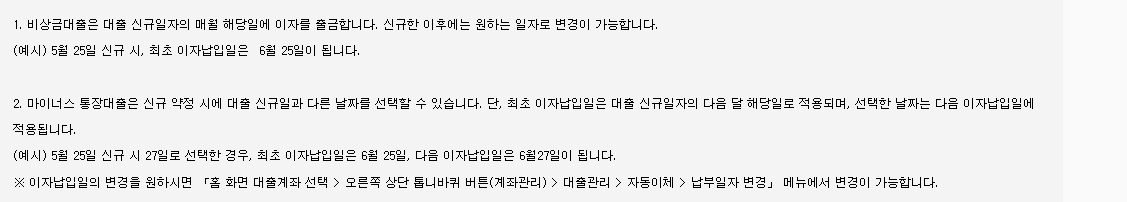 매월 해당 날짜에 이자를 납부하게 되죠. 대출 기간 중에는 납부일을 변경할 수 있지만,