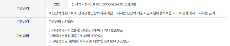 최저 연 6.71% ~ 최고 연 9.99%(신잔액기준 COFIX : 3.21% 2023.08.28 현재)