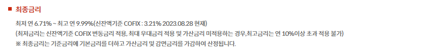 최저 연 6.71% ~ 최고 연 9.99%(신잔액기준 COFIX : 3.21% 2023.08.28 현재)