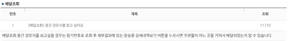 배달조회 중간 경유지를 보고싶을 경우는 등기번호로 조회 후 세부결과에 있는