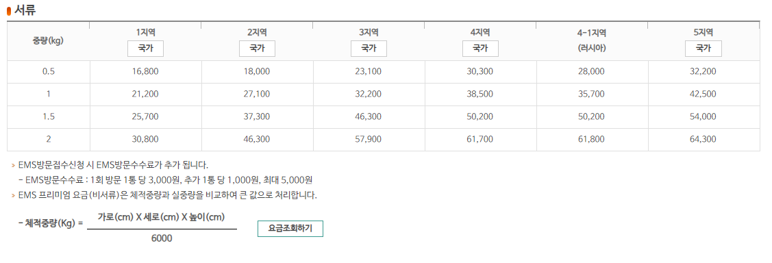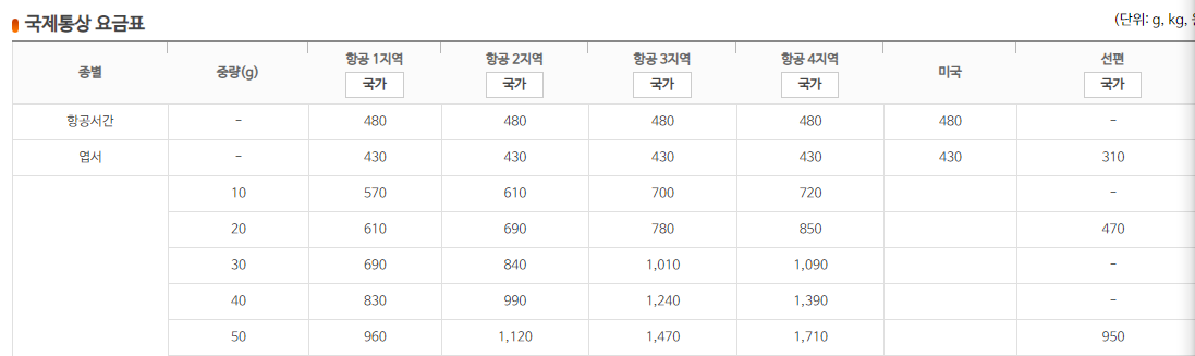 우체국 국제택배 요금표